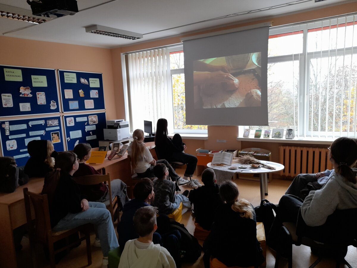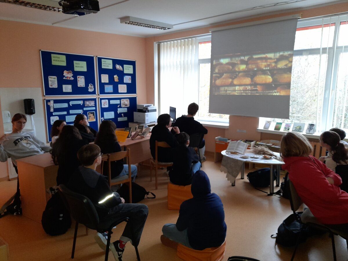 Kasmet gimnazijos bibliotekoje vyksta renginys „Duonos kelias“, šį kartą su mokiniais itin didelį dėmesį kreipėme į duoną smulkiojoje tautosakoje: patarlėse, priežodžiuose, mįslėse, minklėse, anekdotuose, greitakalbėse, mat pats duonos kelias su šiais mokiniais buvo aptartas praeitais mokslo metais.