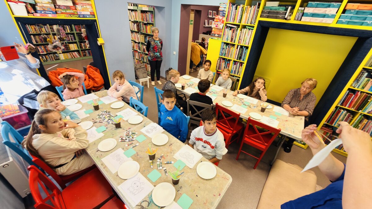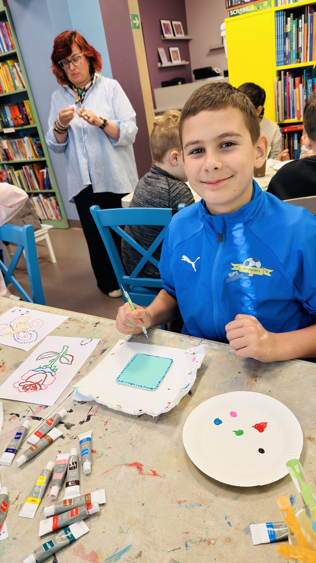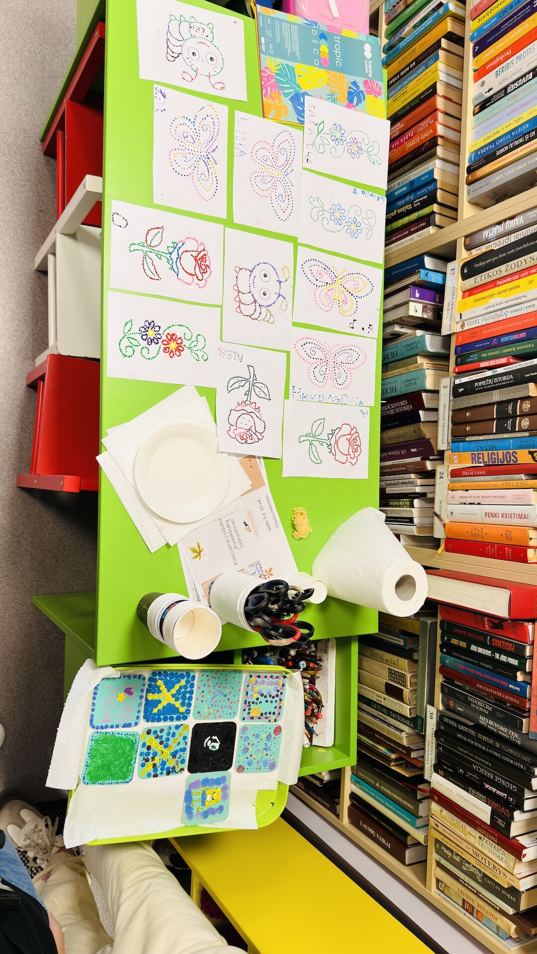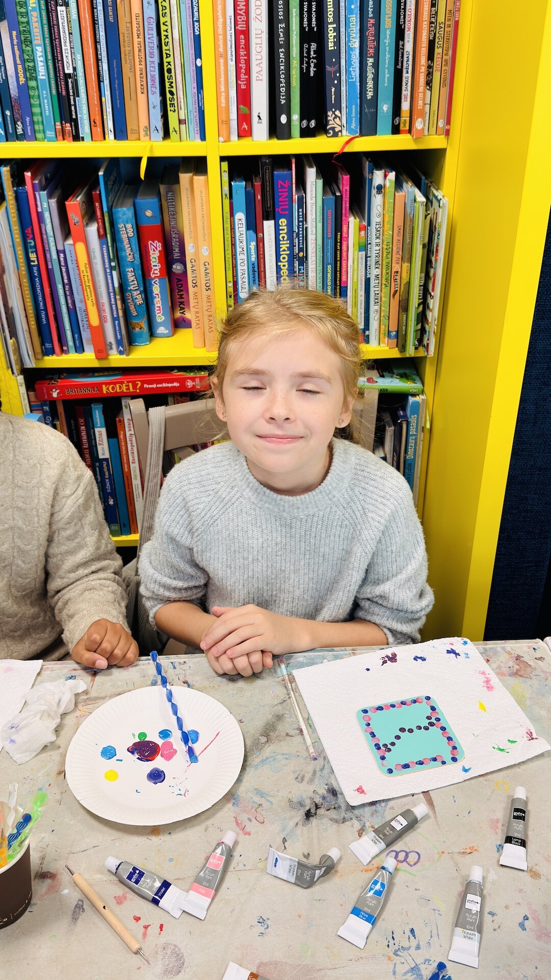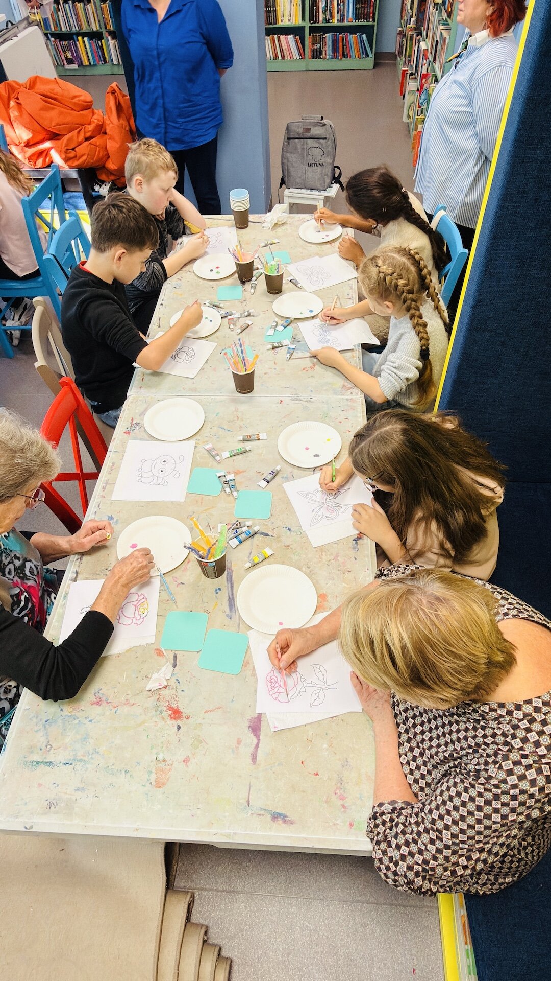 Ekskursija baigėsi Grigiškių bibliotekoje, kur vyko edukacinis užsiėmimas. Mokiniai dalyvavo kūrybinėje veikloje: piešė, spalvino, bendravo su bibliotekos darbuotojais, susipažino su bibliotekos erdvėmis bei knygų įvairove. Jie išbandė taškavimo techniką – mažais taškeliais dekoravo popierių, kuris virto tikrais meno šedevrais. Kiekvienas pasigamino ir originaliai išpuošė padėkliuką arbatos puodeliui, kurį galės parsinešti namo kaip prisiminimą iš šios dienos.