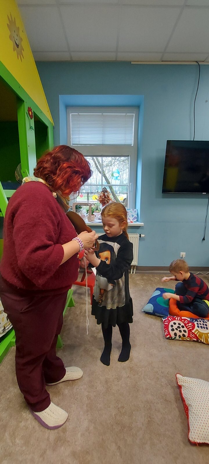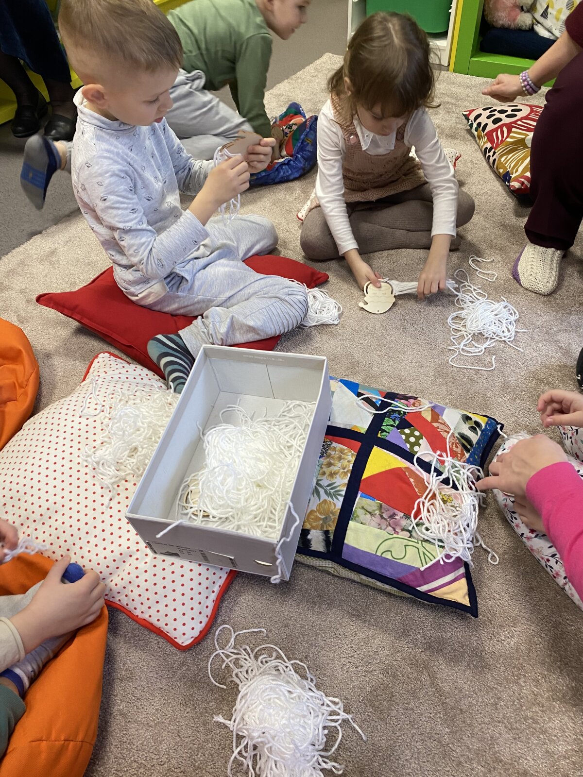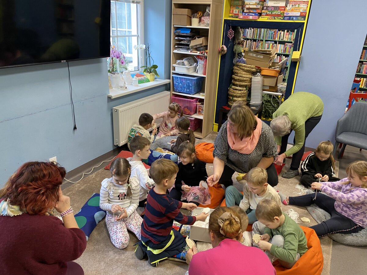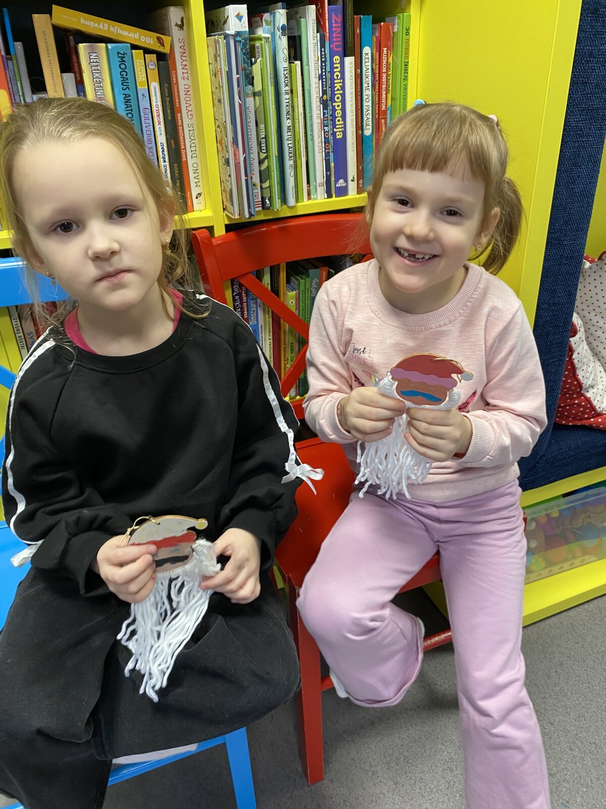 Vaikai klausėsi pasakos “Meškis ir žąsis”, kurią parašė Nadia Kovaliova. Ši istorija moko draugystės, pagarbos ir supratimo. Po pasakos skaitymo mažųjų laukė kūrybinės dirbtuvėlės. Šį kartą vaikai ant medinių Senelių Šalčių vėrė baltas siūles, iš kurių susiformavo pūkuota balta barzdelė. Kiekvienas darbelis tapo unikalus, o bibliotekos datbuotojos noriai padėjo vaikams atlikti visus žingsnius, padrąsino ir skatino kūrybiškumą.