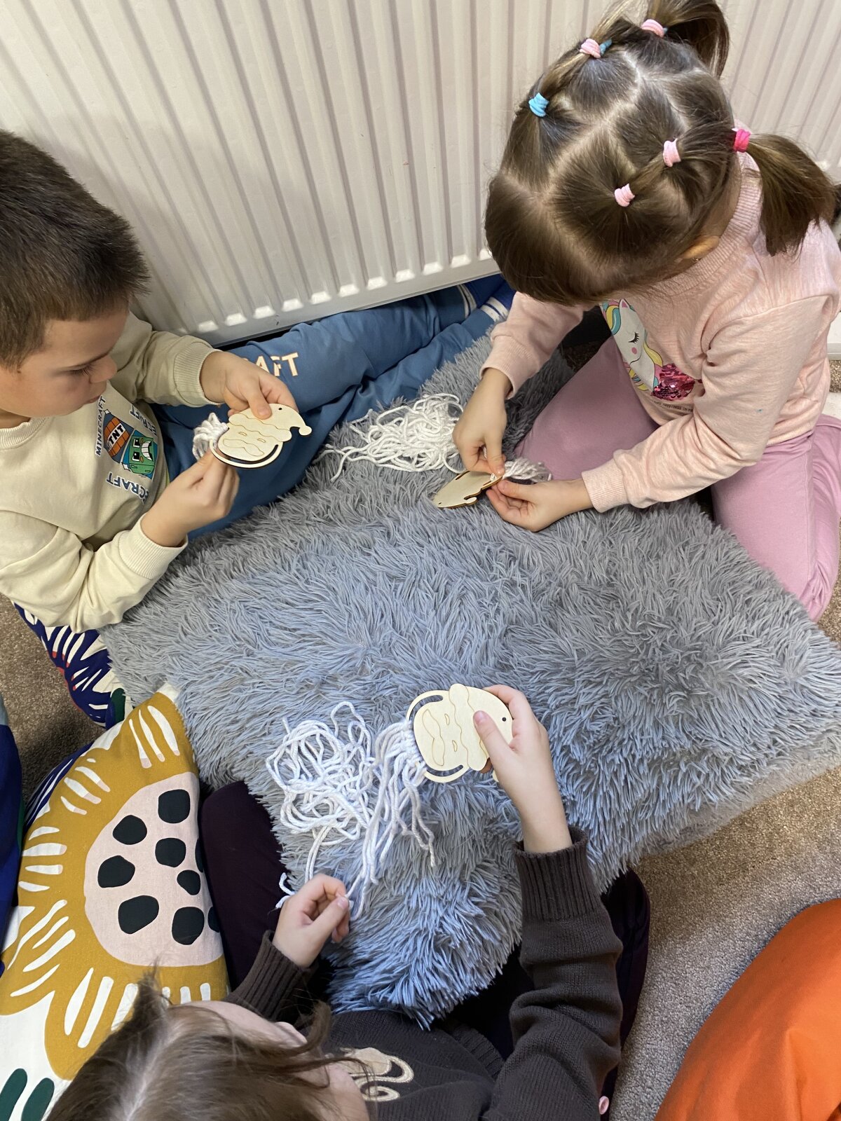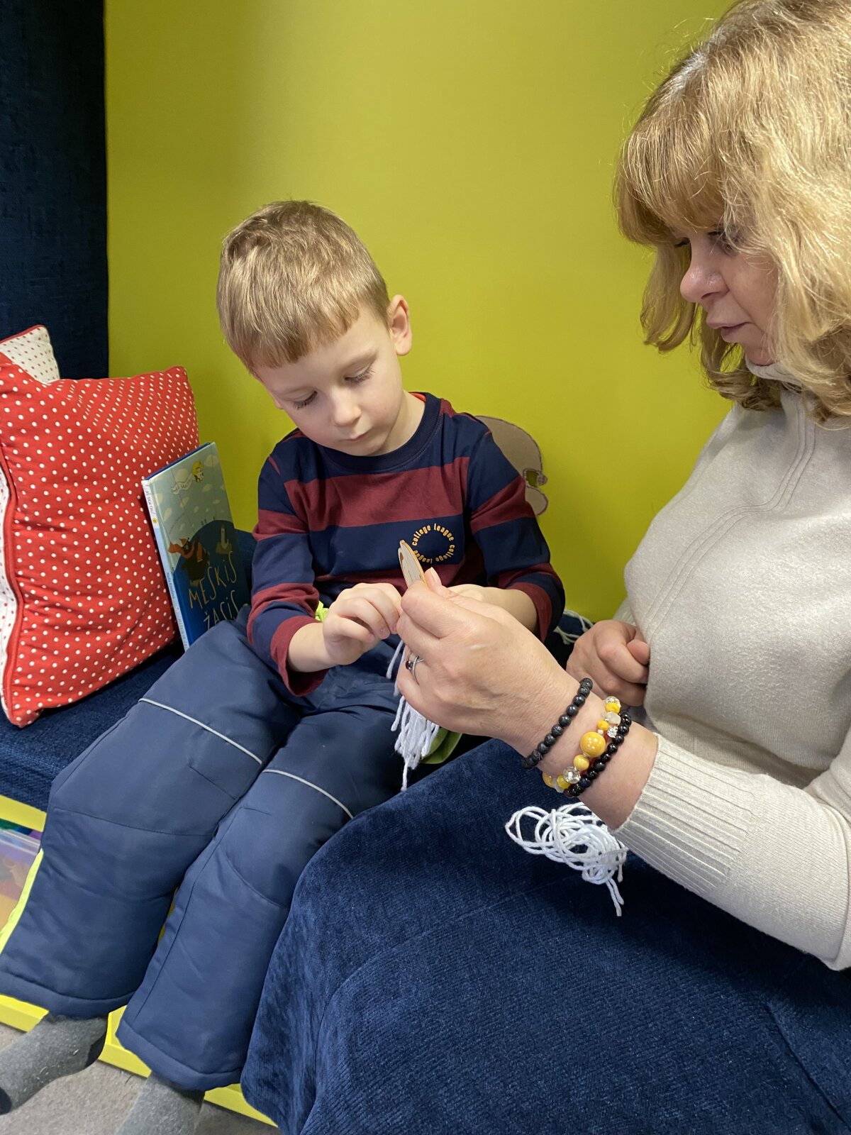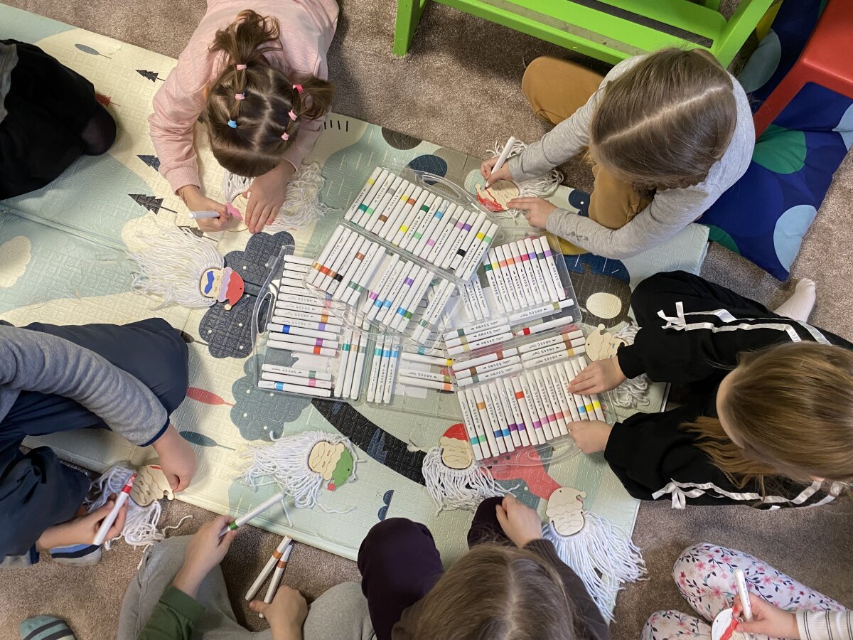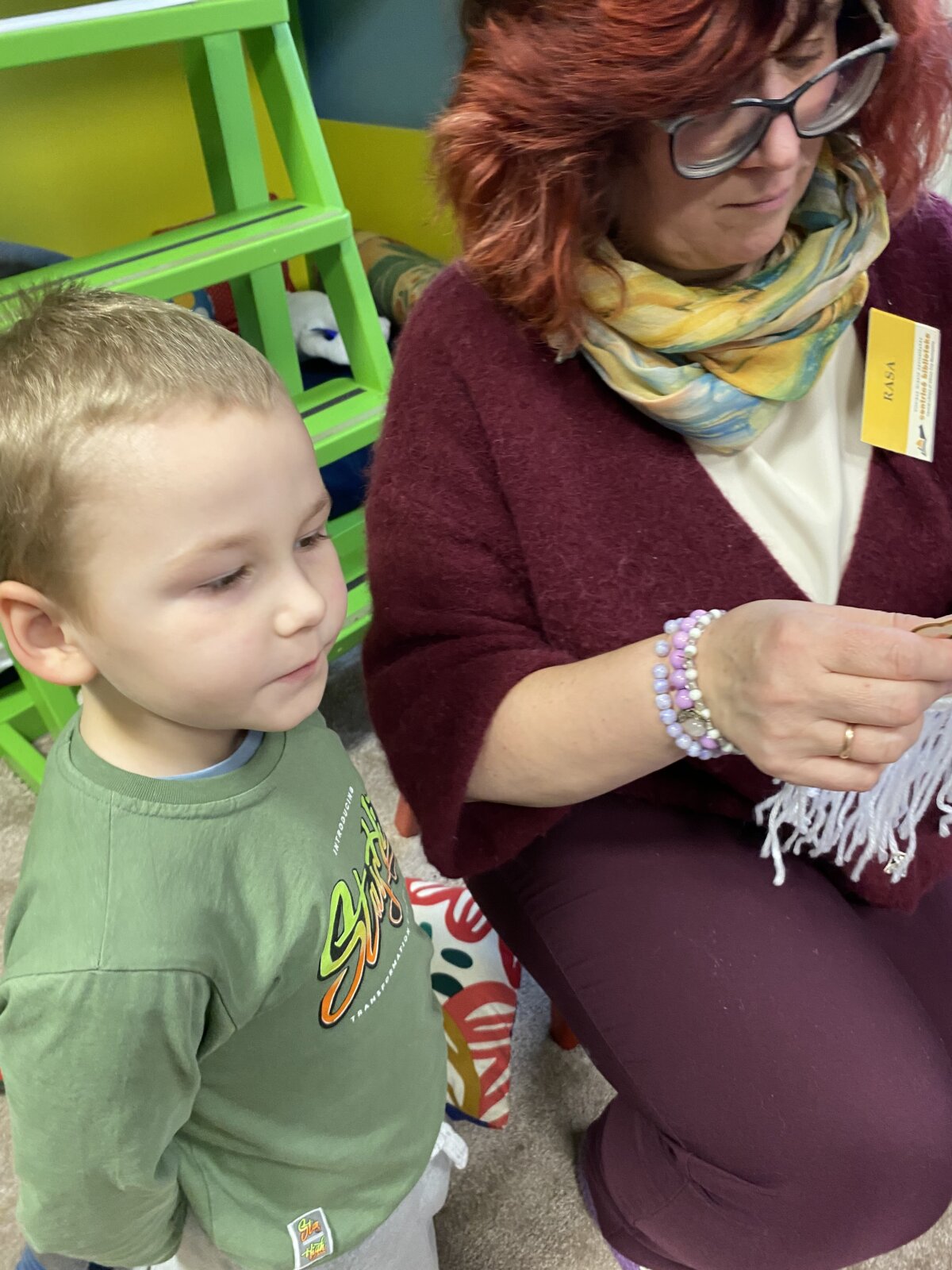 Vaikai klausėsi pasakos “Meškis ir žąsis”, kurią parašė Nadia Kovaliova. Ši istorija moko draugystės, pagarbos ir supratimo. Po pasakos skaitymo mažųjų laukė kūrybinės dirbtuvėlės. Šį kartą vaikai ant medinių Senelių Šalčių vėrė baltas siūles, iš kurių susiformavo pūkuota balta barzdelė. Kiekvienas darbelis tapo unikalus, o bibliotekos datbuotojos noriai padėjo vaikams atlikti visus žingsnius, padrąsino ir skatino kūrybiškumą.