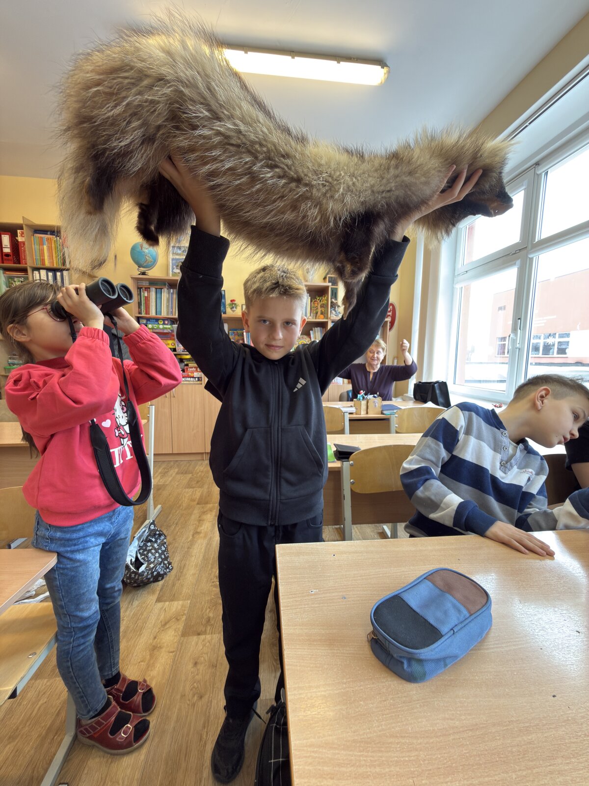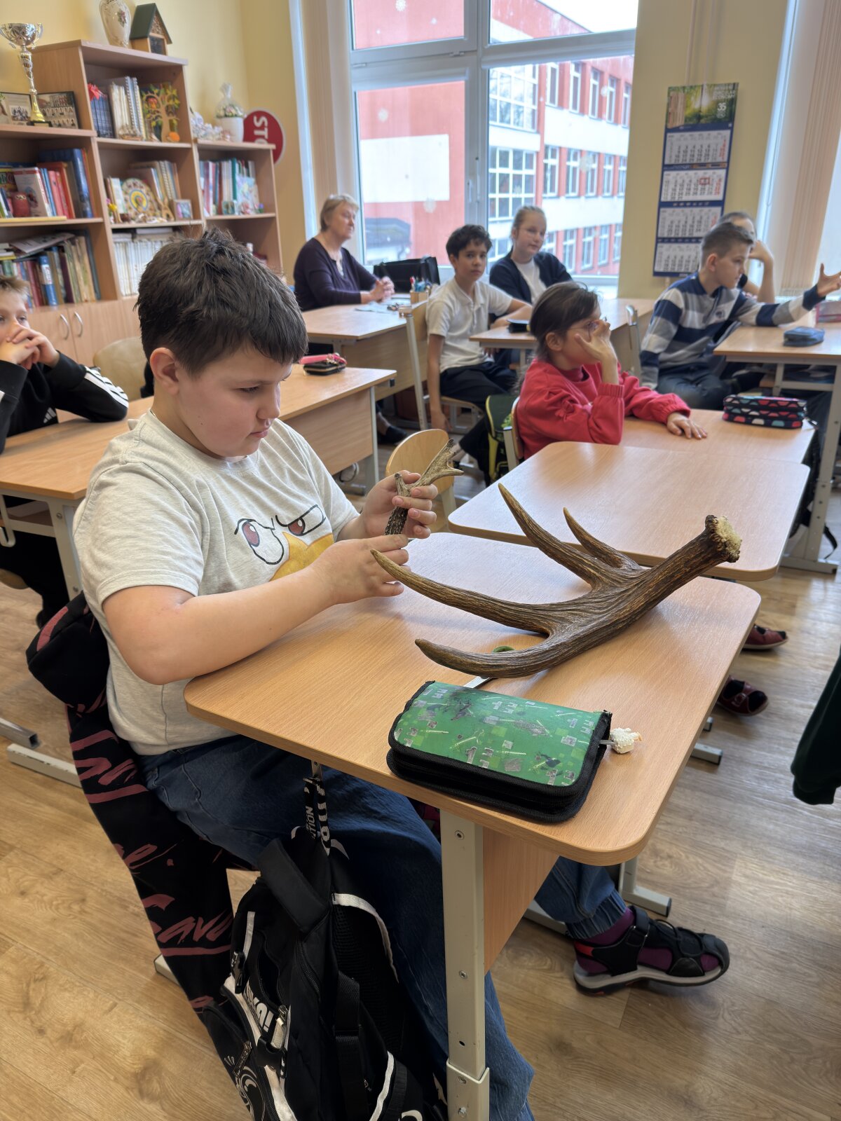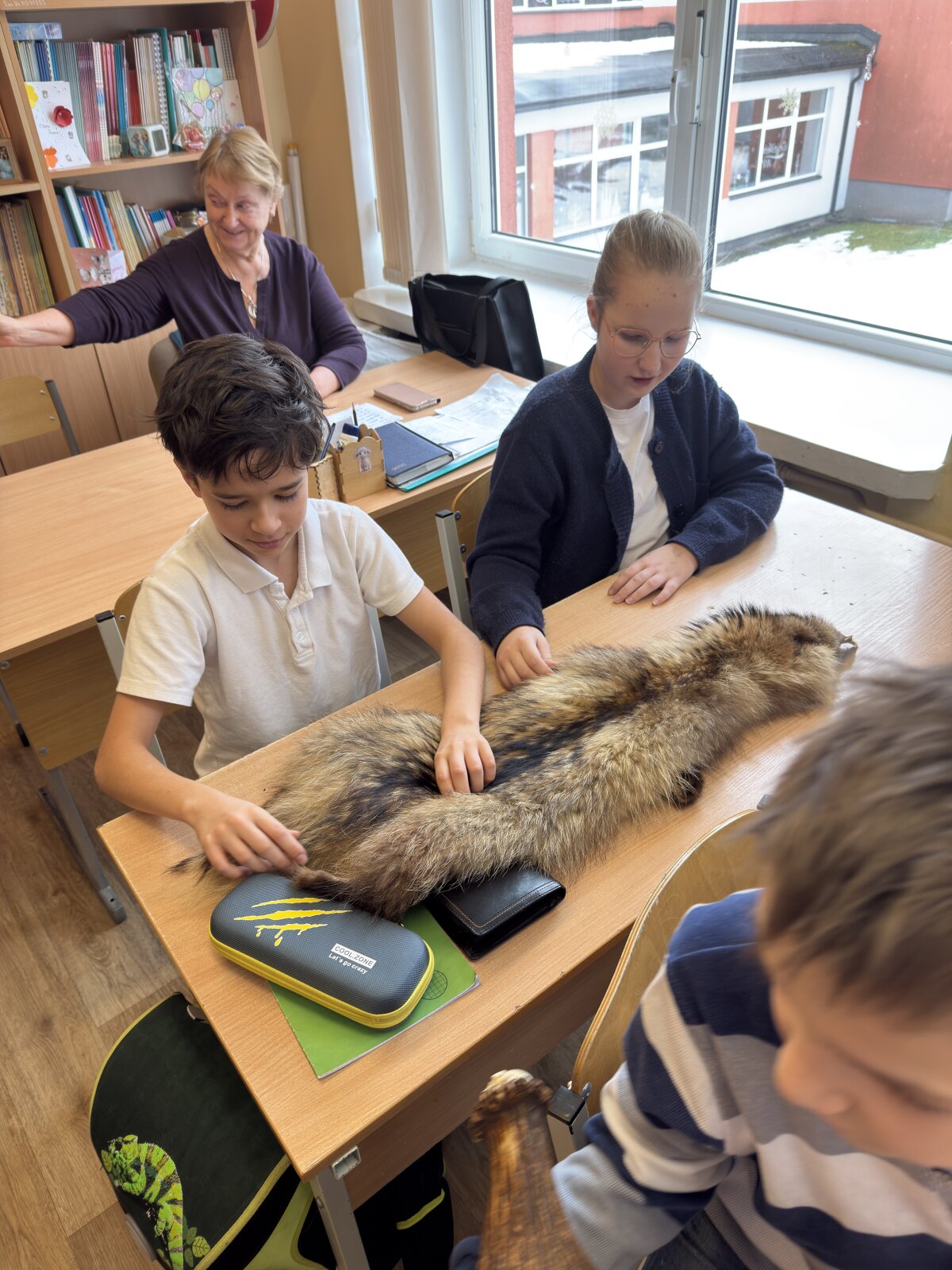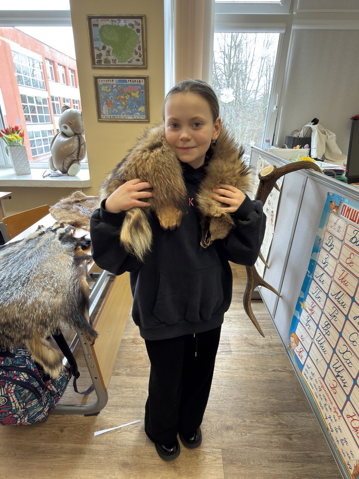 Pamokos metu mokiniai iš arti susipažino su Lietuvos fauna – apžiūrėjo elnio ragus, gyvūnų kaukoles, vilko kailį, kitų laukinių gyvūnų odas, medžioklės įrangą bei knygas apie Lietuvos gyvūniją. Vaikai galėjo eksponatus ne tik apžiūrėti, bet ir juos paliesti, pakelti bei smalsiai užduoti klausimų.