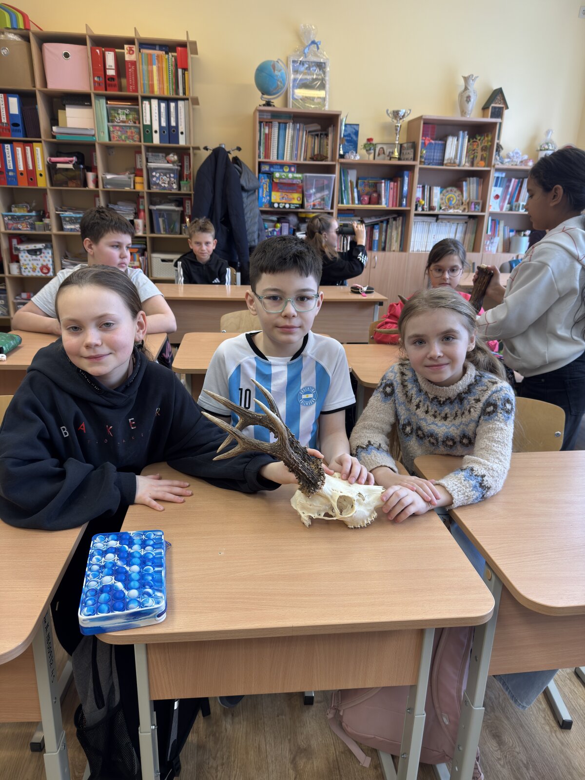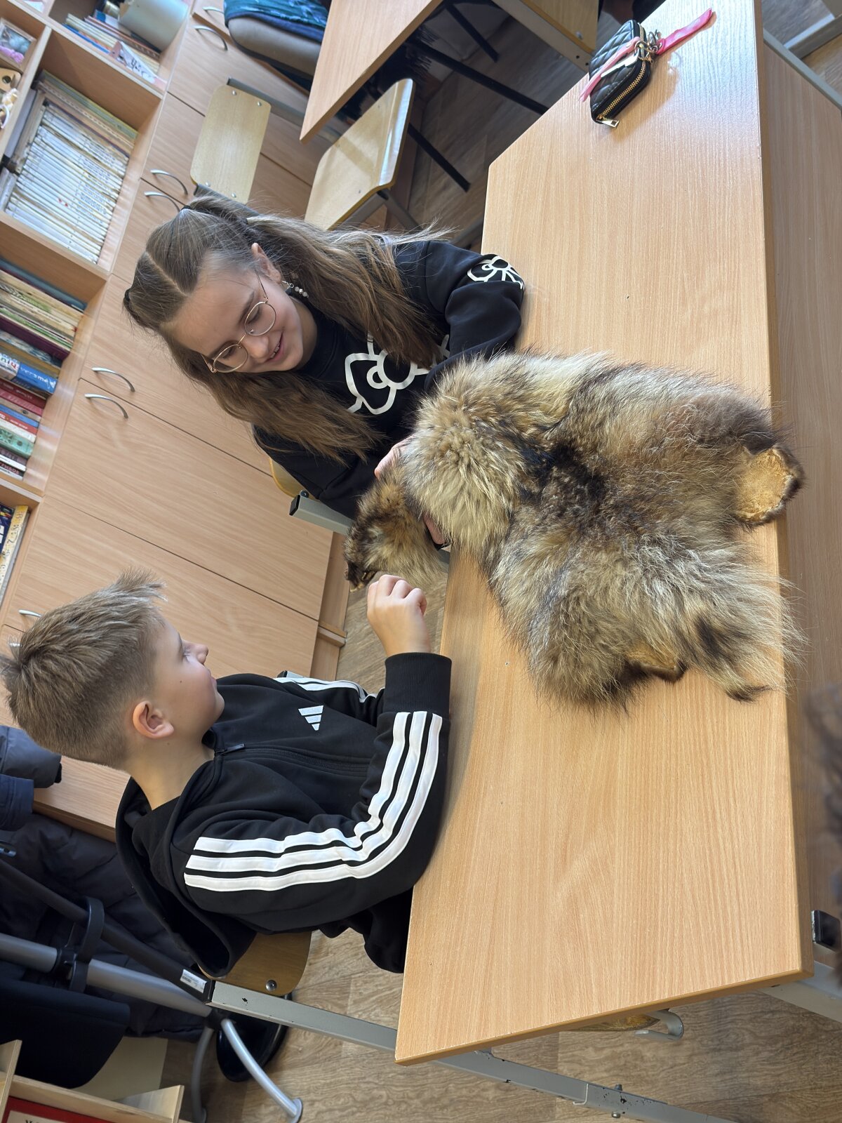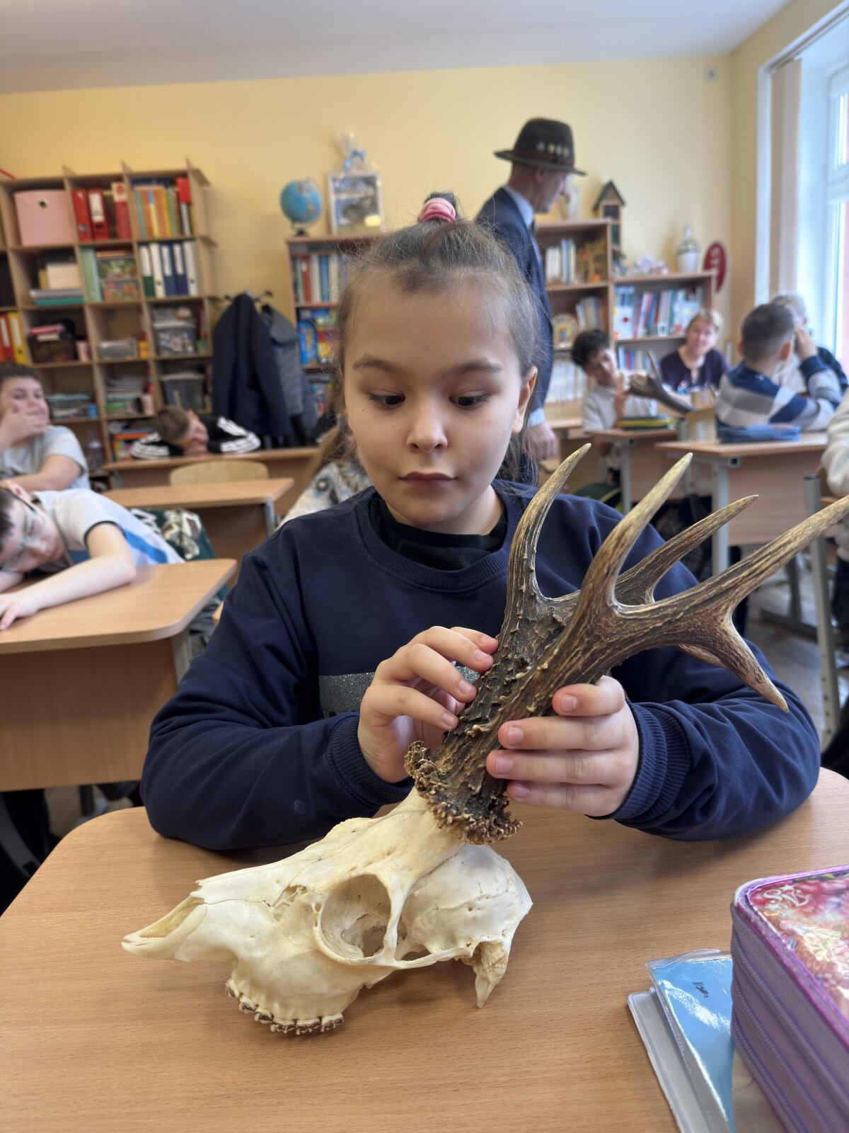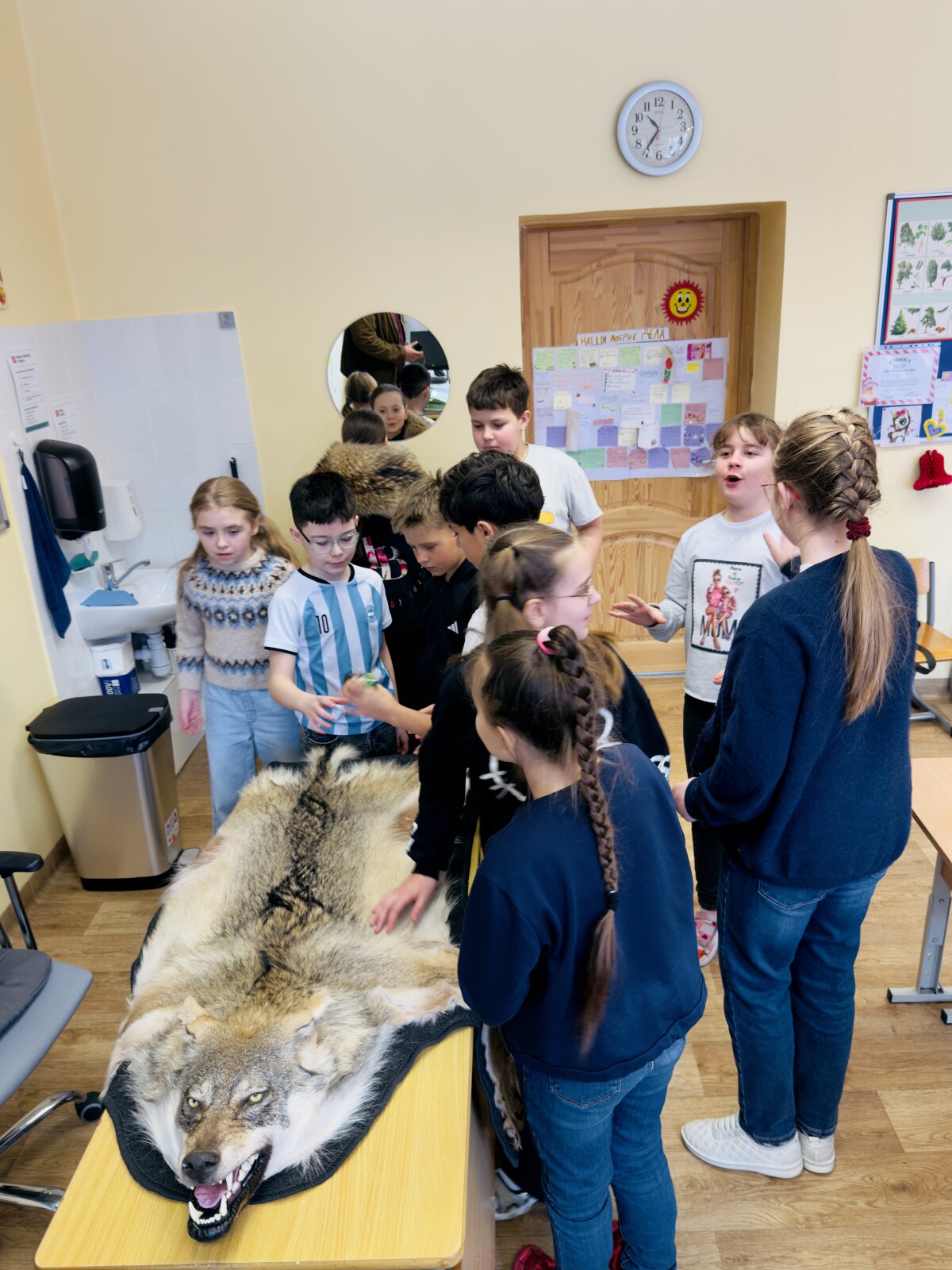 Pamokos metu mokiniai iš arti susipažino su Lietuvos fauna – apžiūrėjo elnio ragus, gyvūnų kaukoles, vilko kailį, kitų laukinių gyvūnų odas, medžioklės įrangą bei knygas apie Lietuvos gyvūniją. Vaikai galėjo eksponatus ne tik apžiūrėti, bet ir juos paliesti, pakelti bei smalsiai užduoti klausimų.
