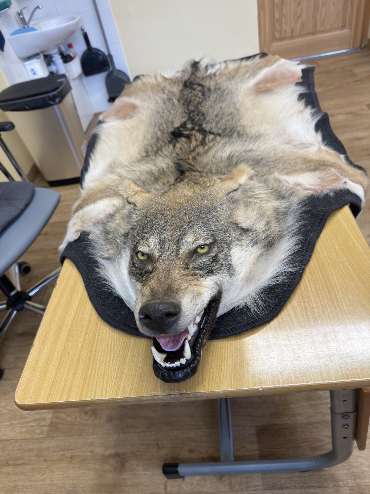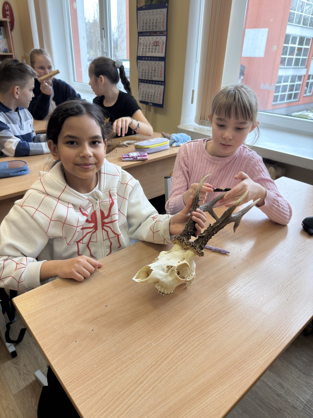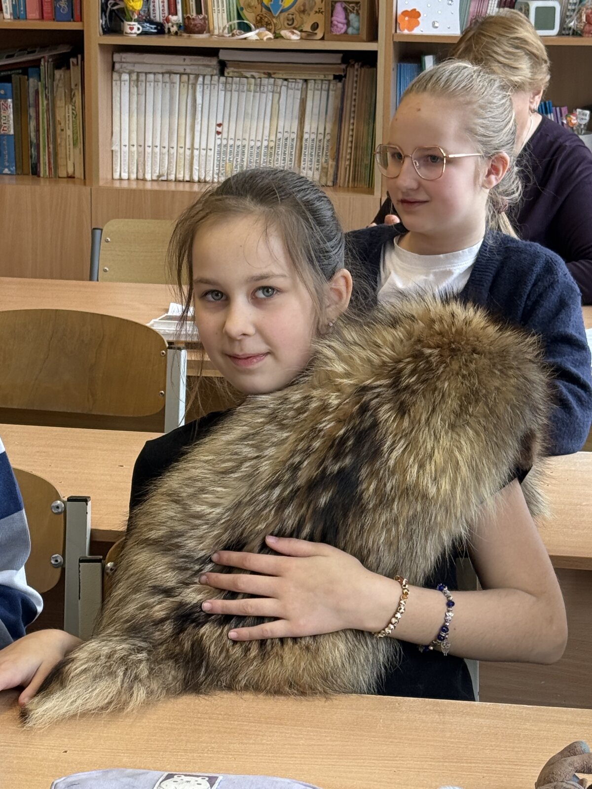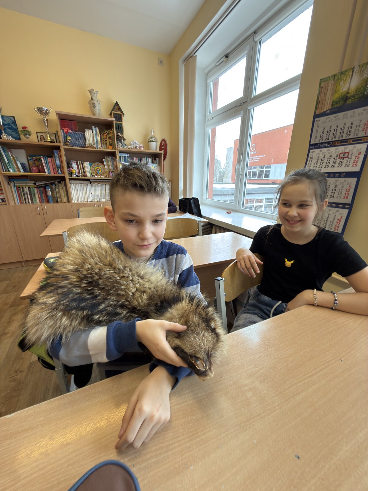 Pamokos metu mokiniai iš arti susipažino su Lietuvos fauna – apžiūrėjo elnio ragus, gyvūnų kaukoles, vilko kailį, kitų laukinių gyvūnų odas, medžioklės įrangą bei knygas apie Lietuvos gyvūniją. Vaikai galėjo eksponatus ne tik apžiūrėti, bet ir juos paliesti, pakelti bei smalsiai užduoti klausimų.