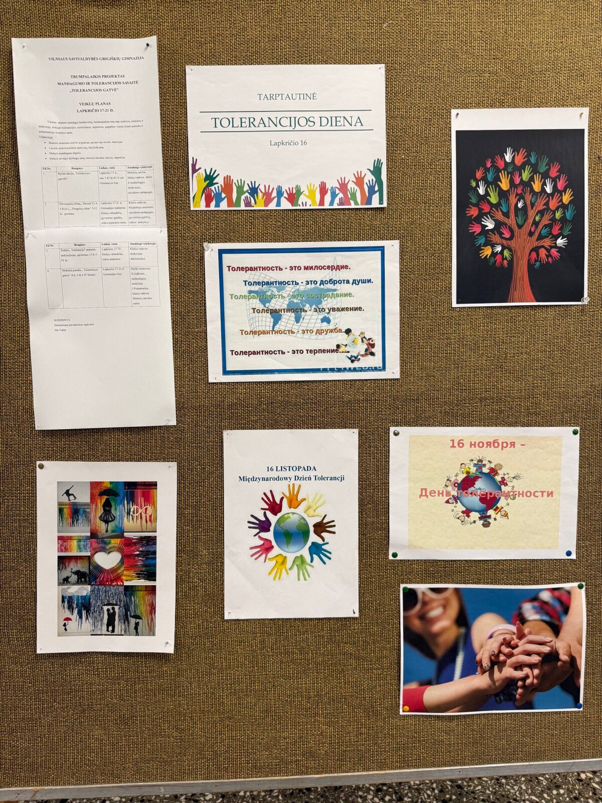 Lapkričio 17d. prasidėjo nuo akcijos ,,Tolerancijos gatvelė”. Kiekvienas mokinys ir mokytojas ant paruoštų namelių iš popieriaus parašė gražius žodžius ir atsakymus į klausimą: ,, Kas man yra tolerancija?”. Visi žodžiai buvo priklijuoti ant atskirų plakatų. Galutinis rezultatas - ilga, spalvinga Tolerancijos gatvelė, pilna namelių su pozityviais žodžiais.