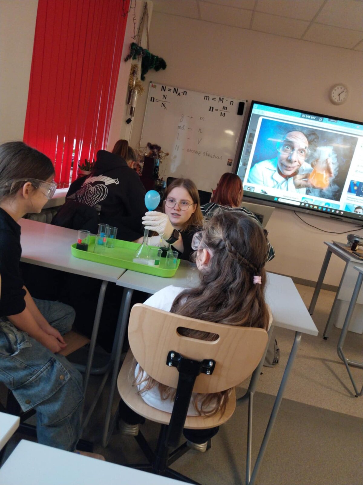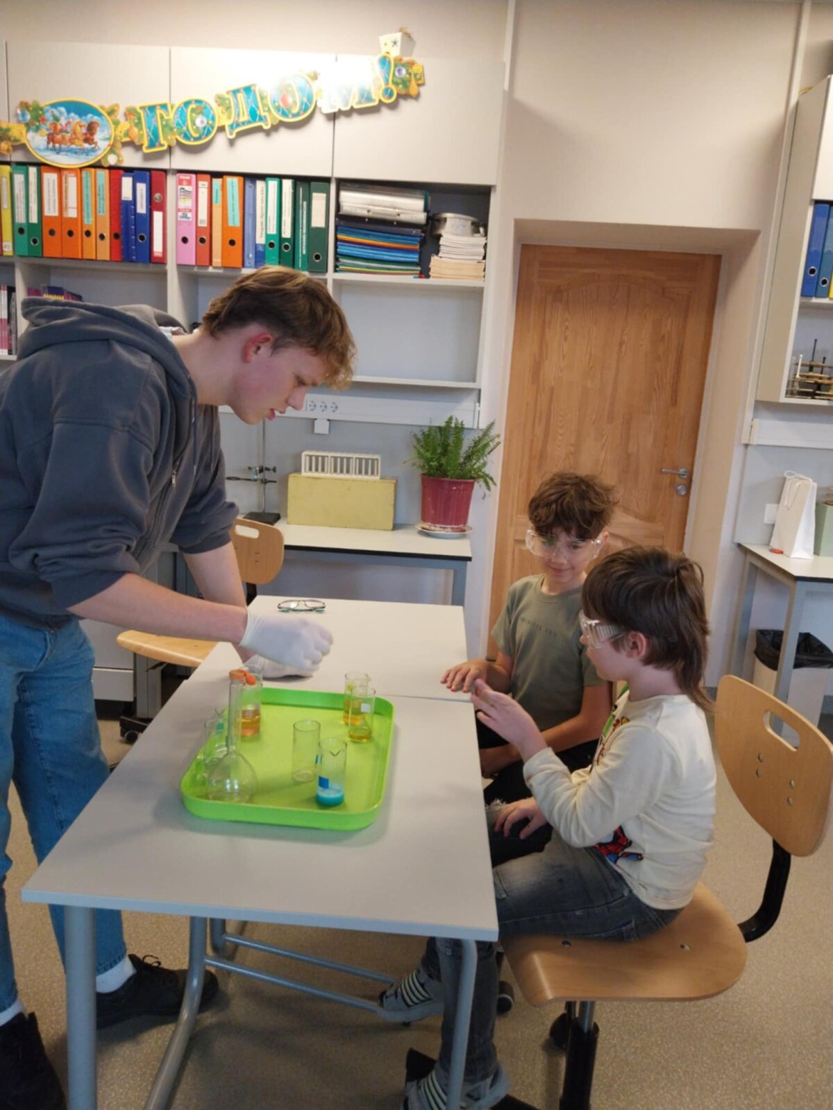 Dvyliktokai vedė veiklą ir padėjo mažiesiems suprasti cheminius reiškinius bei saugiai atlikti bandymus.