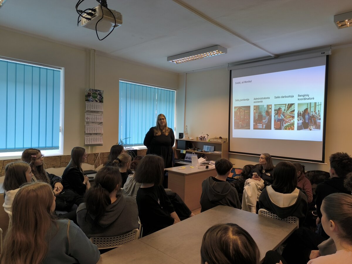 Lapkričio 20 d. mūsų gimnazijoje lankėsi ir su mokiniais susitiko "Lietuvos Junior Achievement" (LJA) projekto "EmpoweringGirl" dalyvė, tarptautinės kompanijos „Vinted“ atstovė, Monika Petronienė. Susitikimo metu viešnia papasakojo apie savo kelią į IT: pirmuosius žingsnius mokykloje, studijas, pirmuosius iššūkius bei patirtis, galiausiai atvedusias į darbą „Vinted“. Ji atskleidė, kaip kuriamos ir tobulinamos platformos funkcijos, kokia technologinė infrastruktūra slypi už populiariosios programėlės, ir su kokiomis užduotimis tenka susidurti programuotojų komandai. LJA projektas "Empowering Girl" yra skirtas merginoms, siekiant paskatinti jas drąsiau žengti į technologijų, inžinerijos ir programavimo sritis, bet susitikimuose laukiami ir vaikinai.